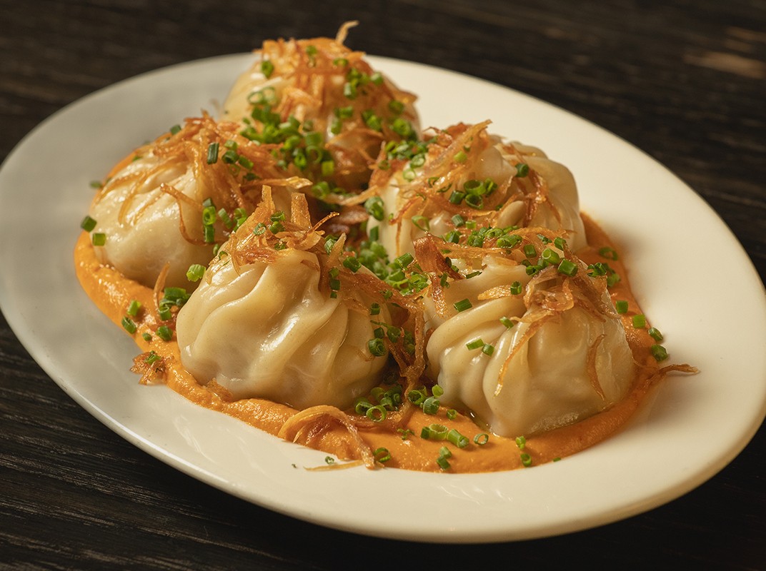 MOMOS, BAHARAT CHICKEN DUMPLINGS, TOMATO HARISSA SAUCE, CRISP SHALLOT