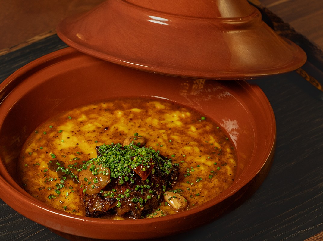CHEEK, "BARON" SPICED, SAFFRON ORZO, GREEN TOMATO CHUTNEY