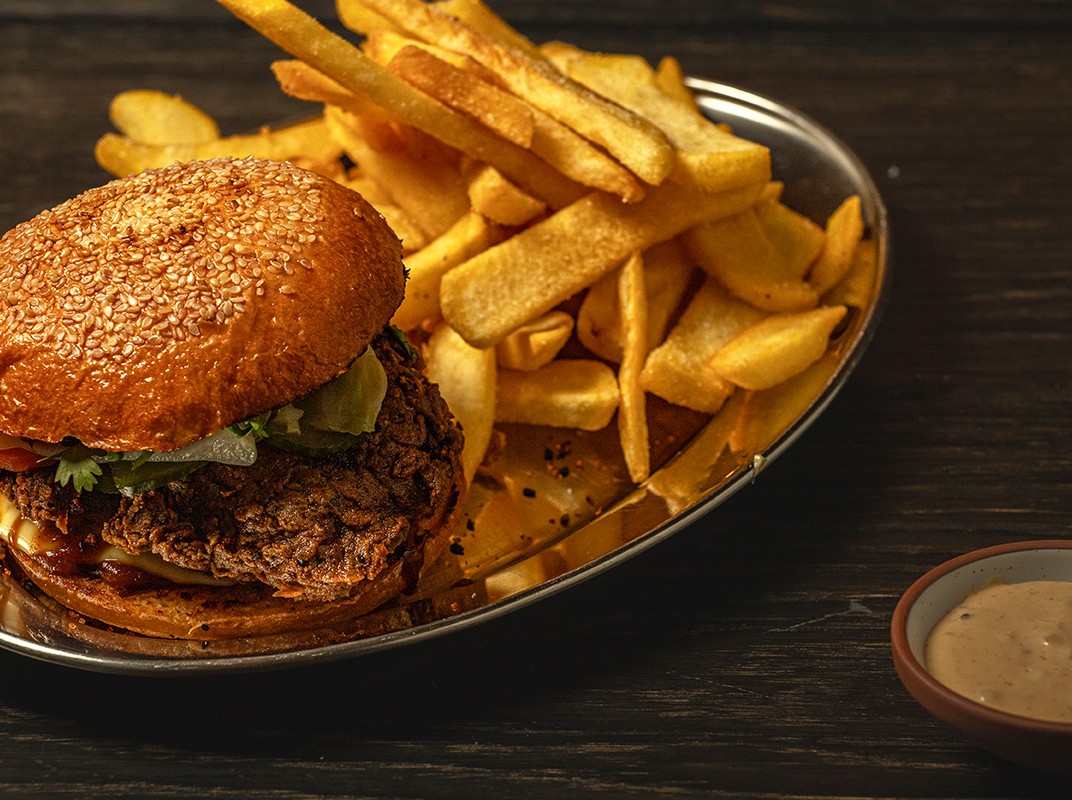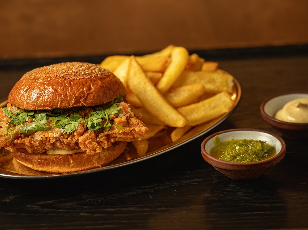 SEABASS, BRIOCHE BUN, CRISP, CILANTRO, HOUSE-PICKLES, TARATOR TARTAR, FRIES