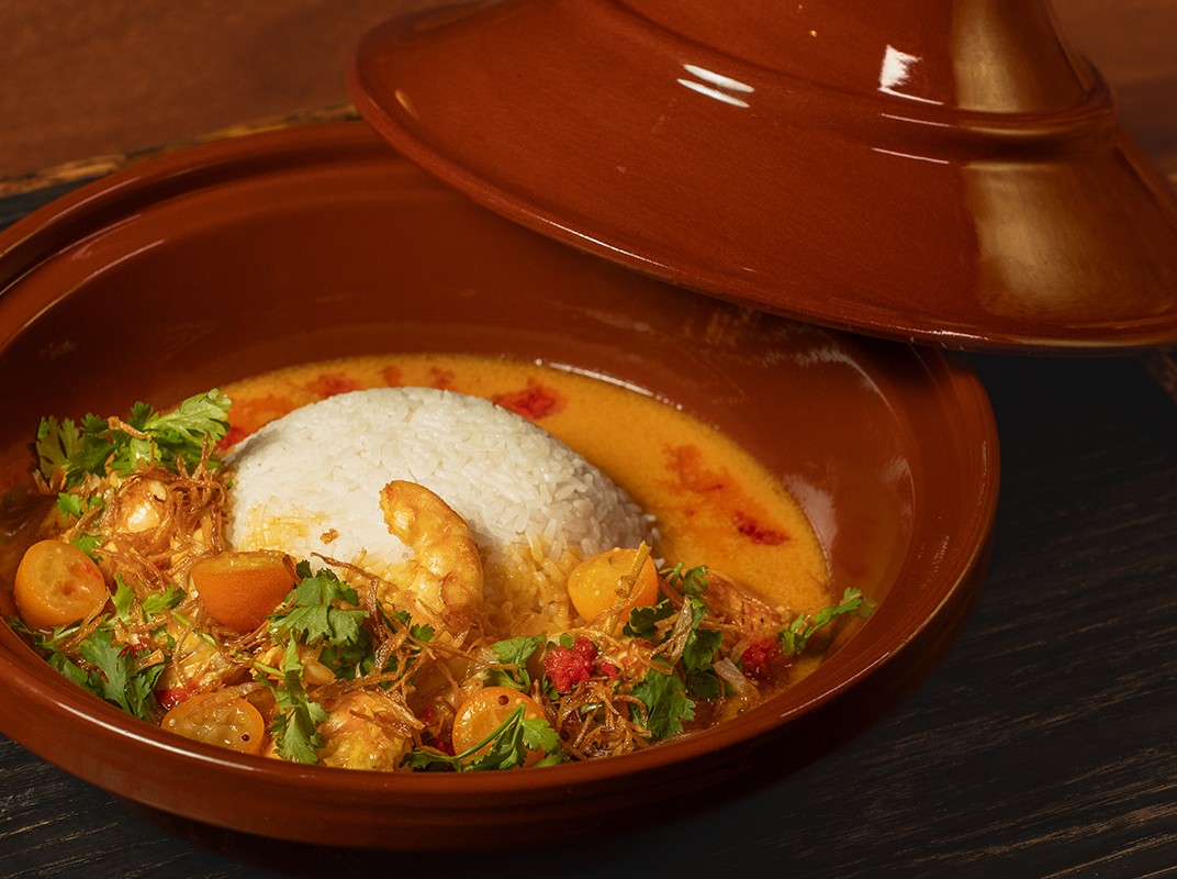 CURRY, FISH, SHRIMP, COCONUT, CRISP SHALLOT, KUMQUAT, CORIANDER, CHILLI, RICE