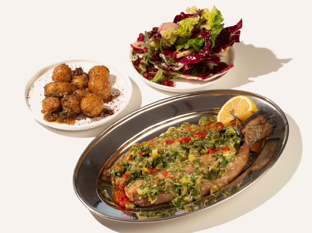 FISH OF THE DAY, WHOLE ROASTED, CAPER SALSA, SUCRINE SALAD, BABY POTATO