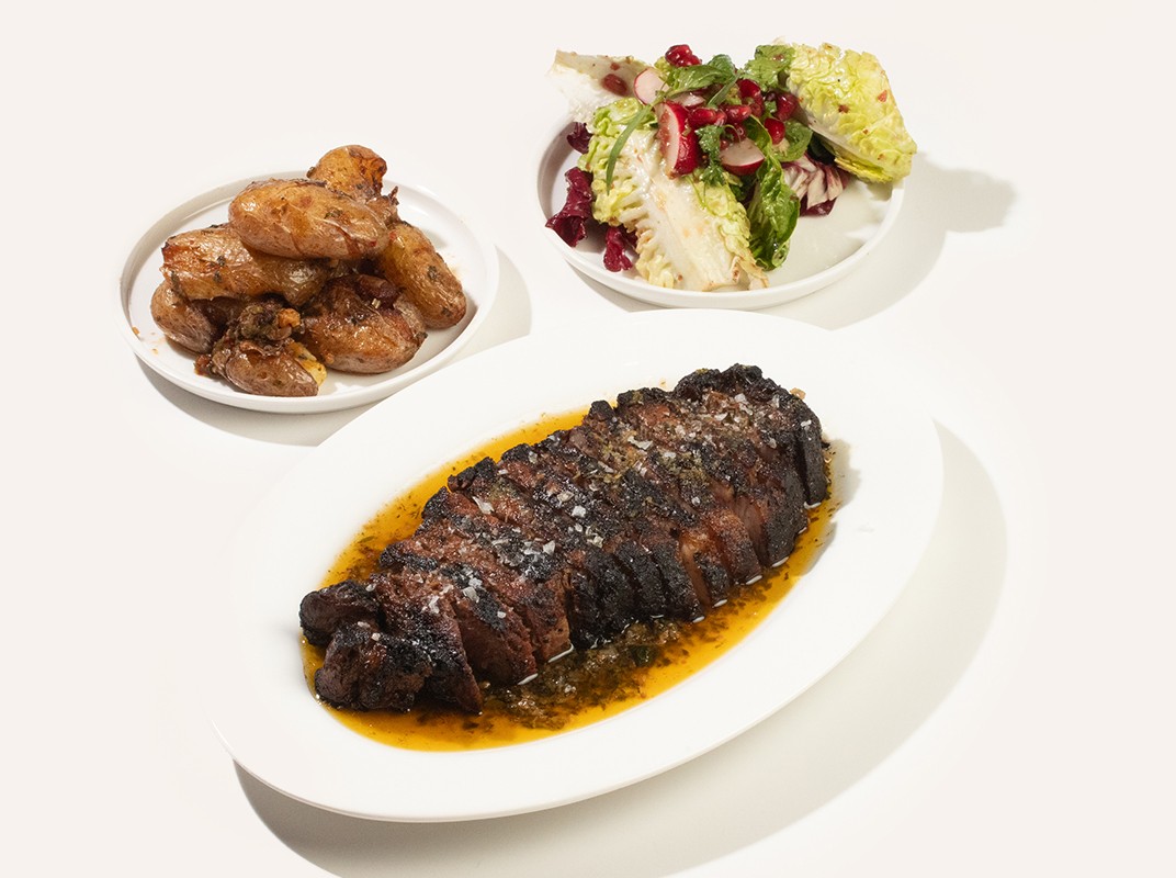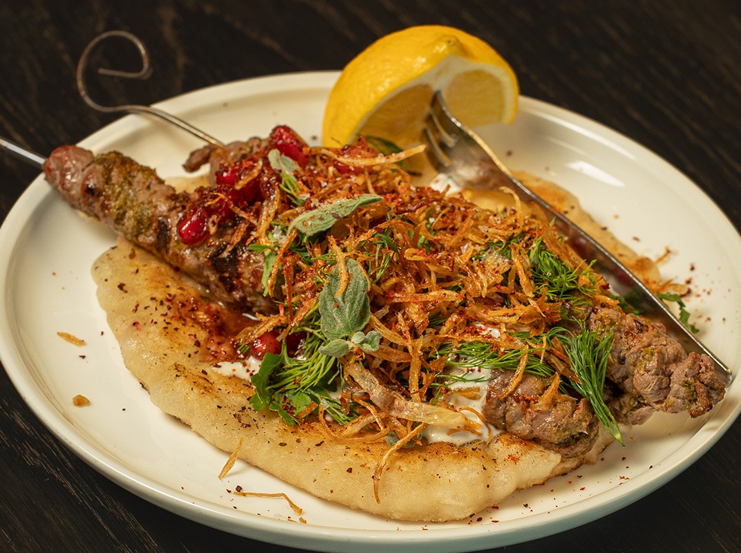 TENDERLOIN SKEWERS, TAHINA, POMEGRANATE, SOFT HERBS, CRISP SHALLOT, BREAD