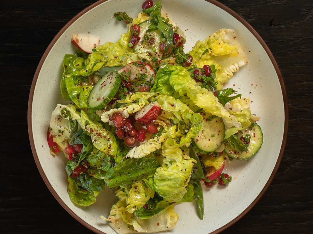 BABY GEM CUCUMBER, RADISH, POMEGRANATE, SPRING ONION, LEMON DRESSING