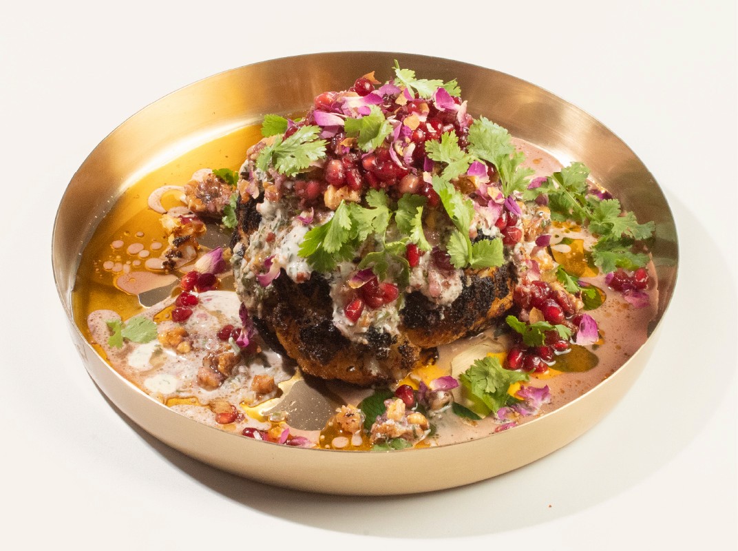 CAULIFLOWER, WHOLE ROASTED, “SPICED”, YOGHURT TAHINI, WALNUT, POMEGRANATE, ROSE