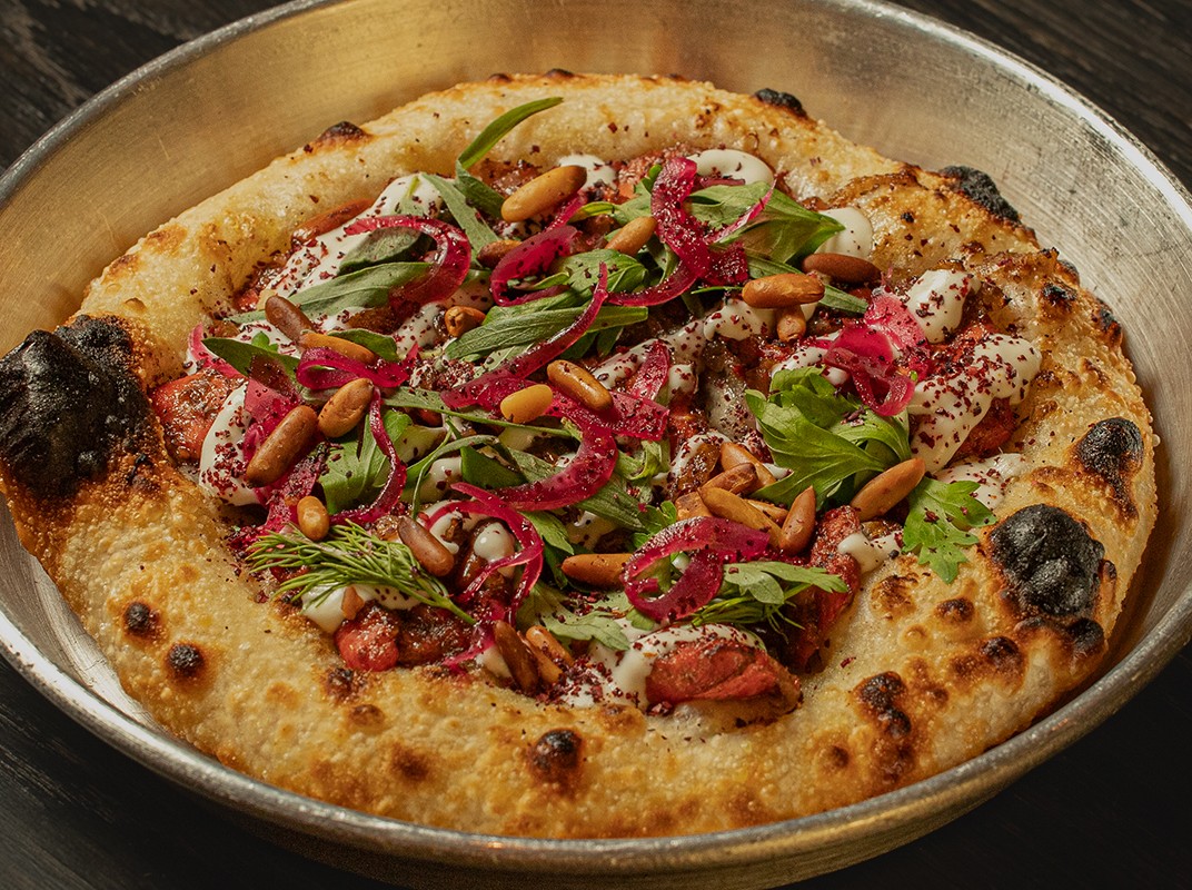 MUSAKHAN, CHICKEN CONFIT, SUMAC, PICKLED ONION, SOFT HERBS, PINE NUTS