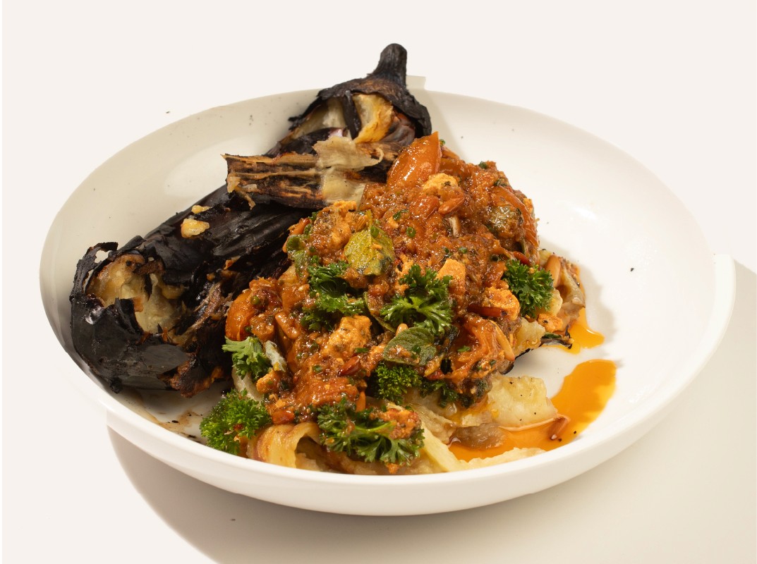 EGGPLANT, ROASTED, SOFT HERBS, FETA, PEPPER, PINE NUT