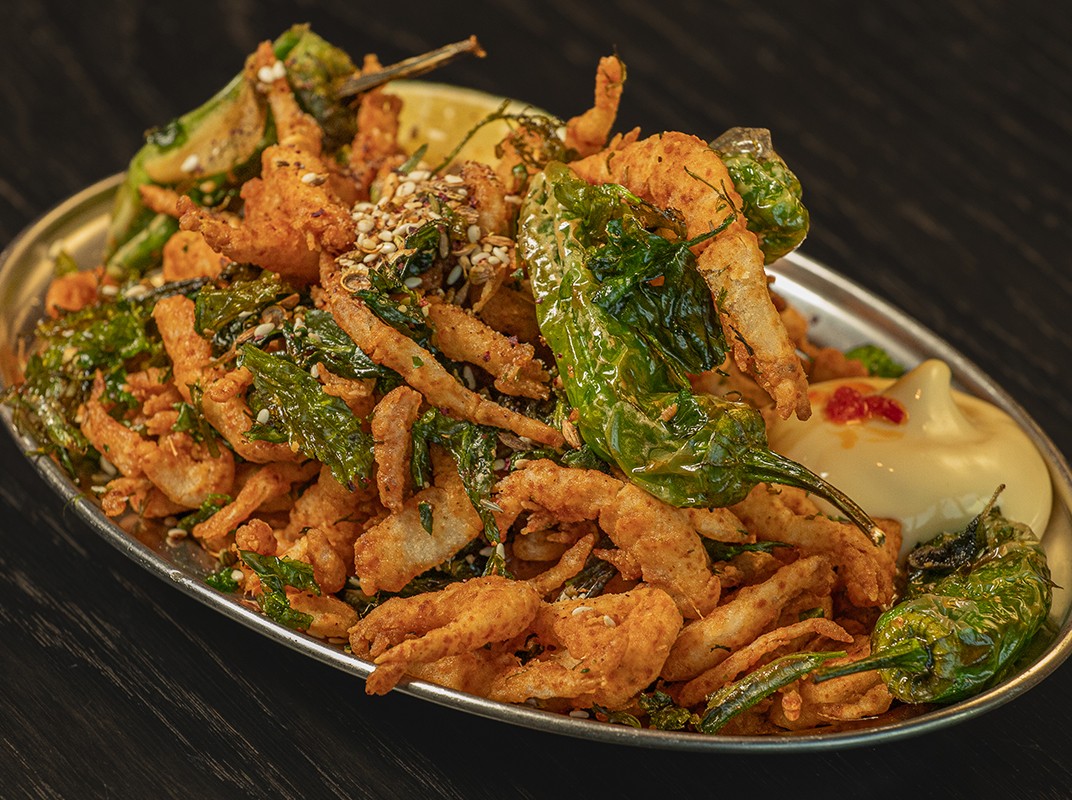BIZRI, CRISP BABY SHRIMP, HERBS, PADRON, CHATTA, KEWPIE, LIME