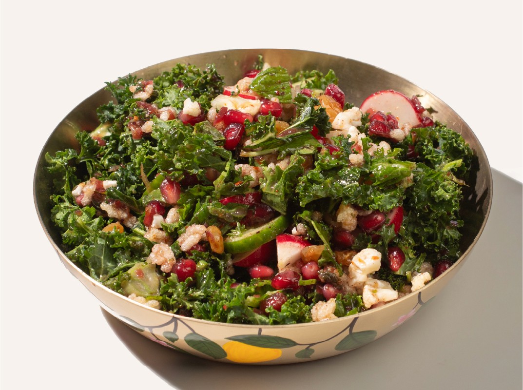 KALE, PUFFED-RICE, HERBS, RADISH, CUCUMBER, CAULIFLOWER, RAISIN, CITRUS DRESSING