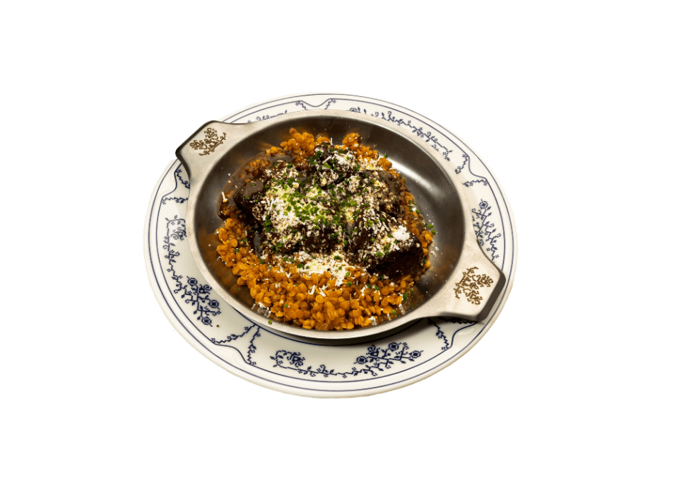 Hunkar Begendi with slow cooked beef cheeks, smoked eggplant and Feta cheese