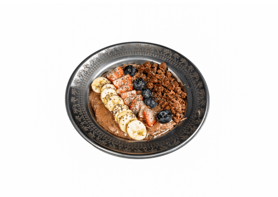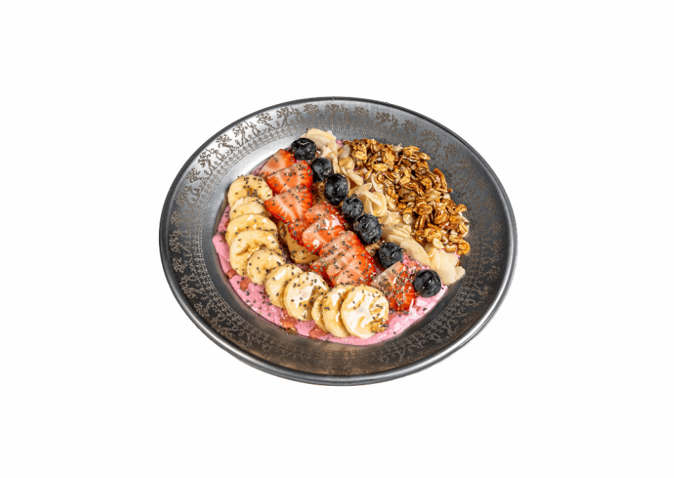 Frozen Greek yoghurt with red fruits, banana, granola, berries and peanut butter
