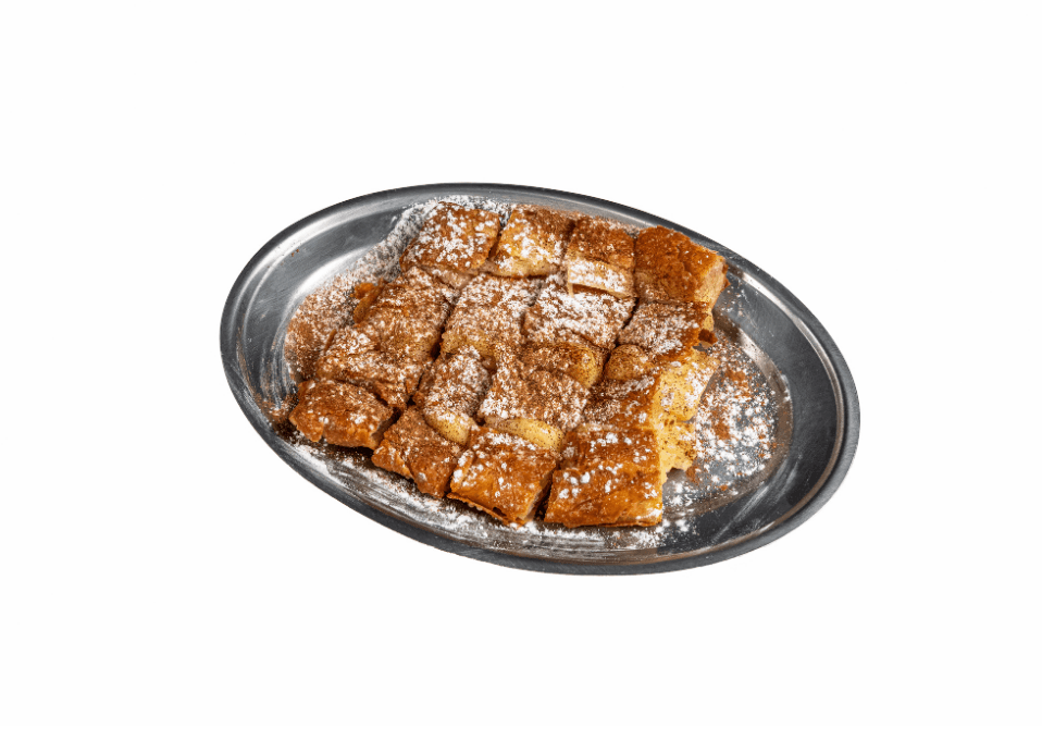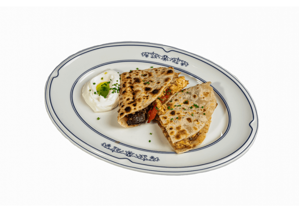 Scrambled eggs strapatsada with spicy sausage and yoghurt on perek phyllo
