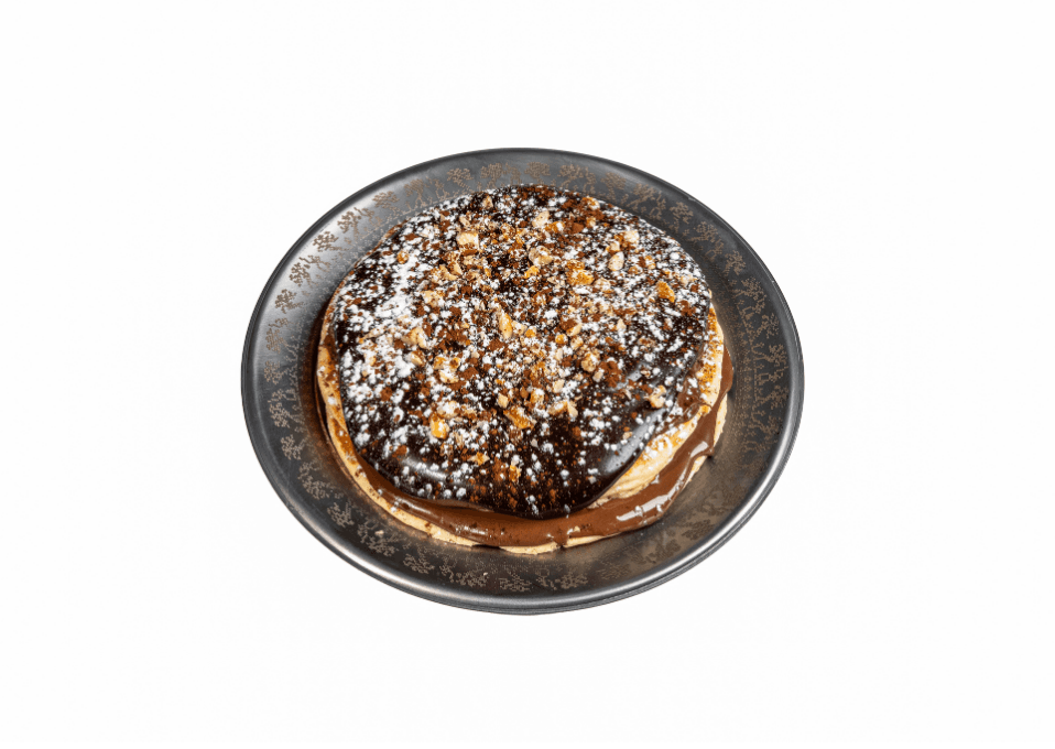 Pancake with hazelnut praline, bitter chocolate and caramelised nuts