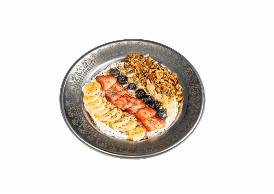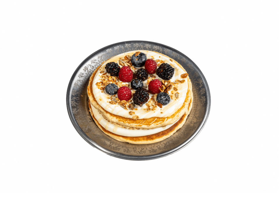Pancake with Greek yoghurt, honey, fruits and homemade granola
