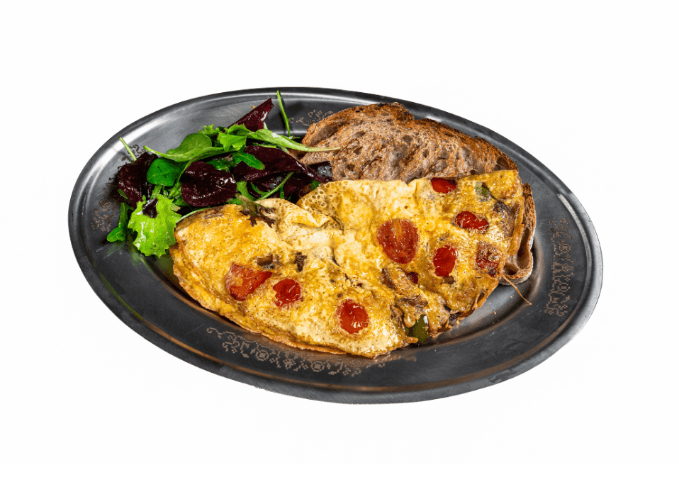Omelette with mushrooms, cherry tomatoes, peppers and Greek cheeses