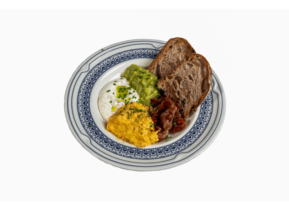 Scrambled eggs with sourdough, avocado, cream cheese and beef bacon