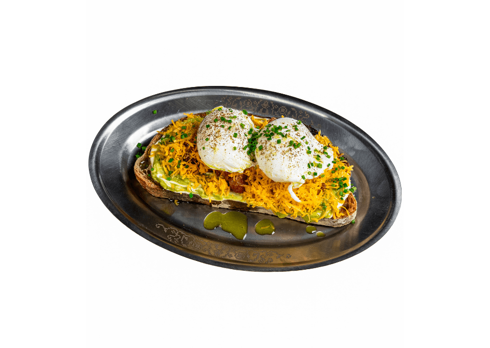 Poached eggs on sourdough with avocado, cheddar, mayo and beef bacon
