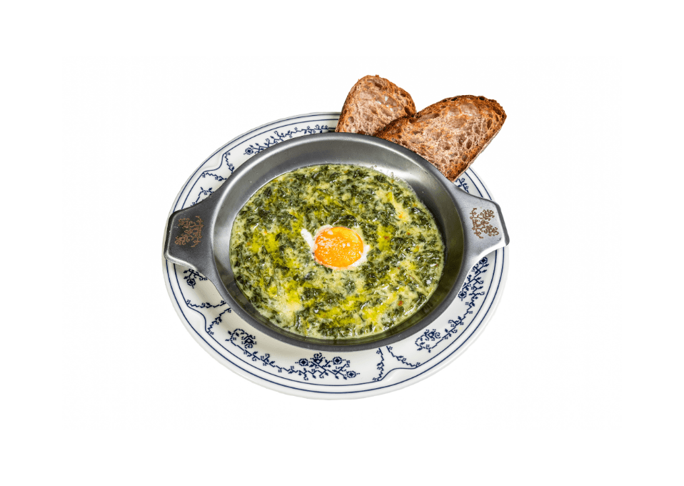 Spanakopita filling with feta, spinach and herbs served with sourdough and egg yolk