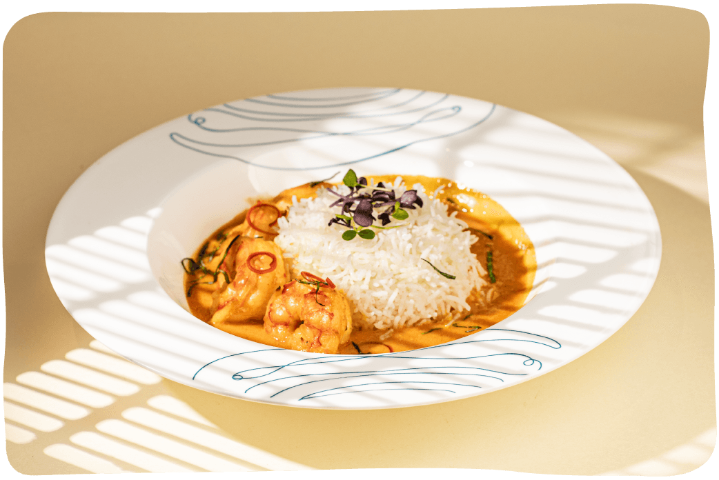 Grilled fresh shrimp with Tom Yum sauce served with steamed white rice