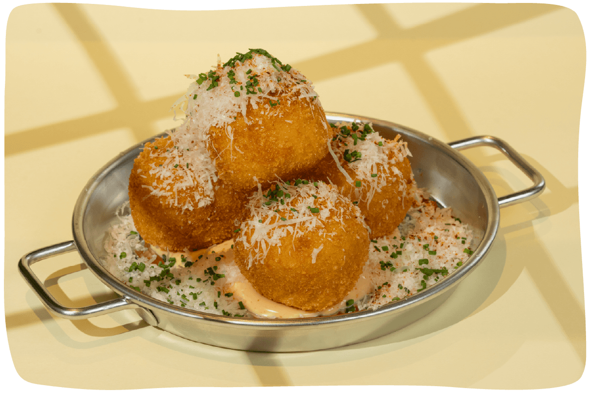Crispy fried risotto balls stuffed with mozzarella and beef ragu, served with basil tomato sauce