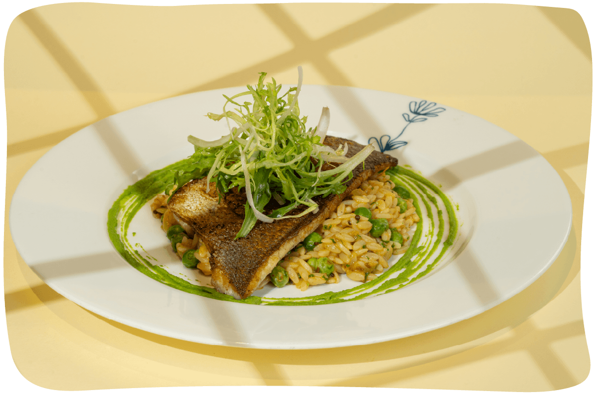 Fresh seabass pan seared, green tomato chutney orzo, peas pure