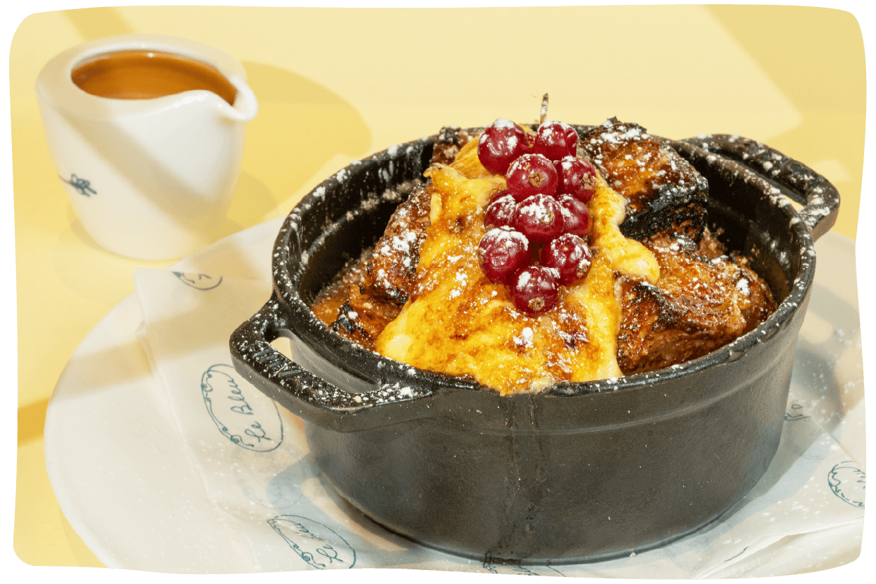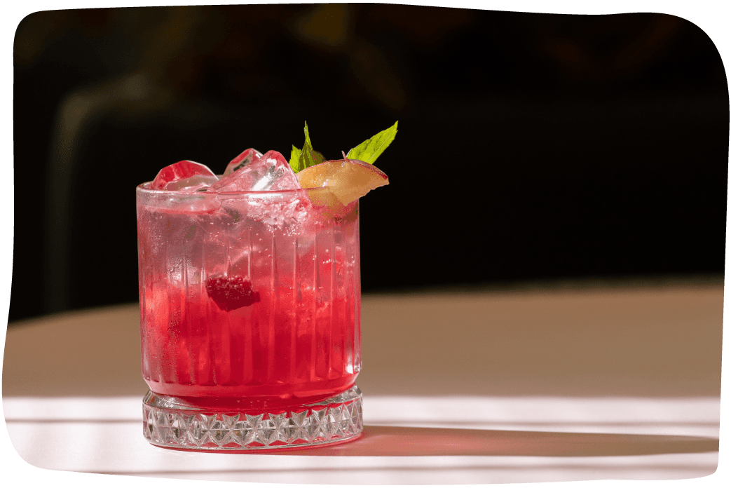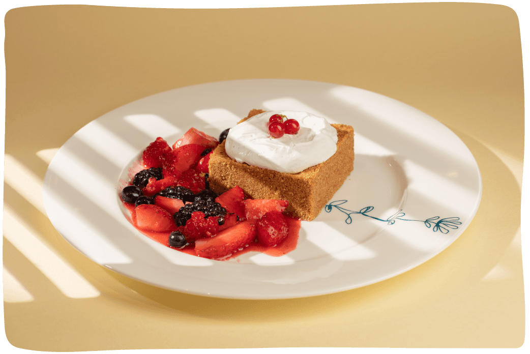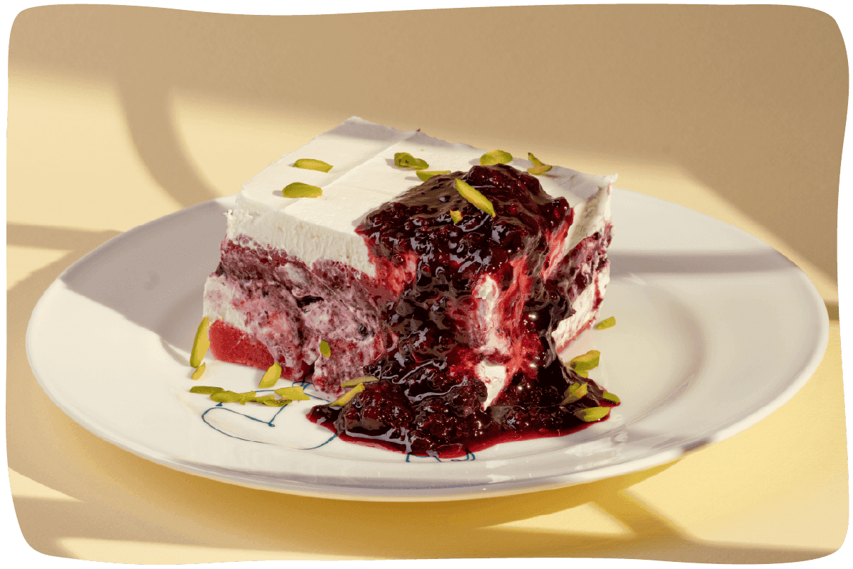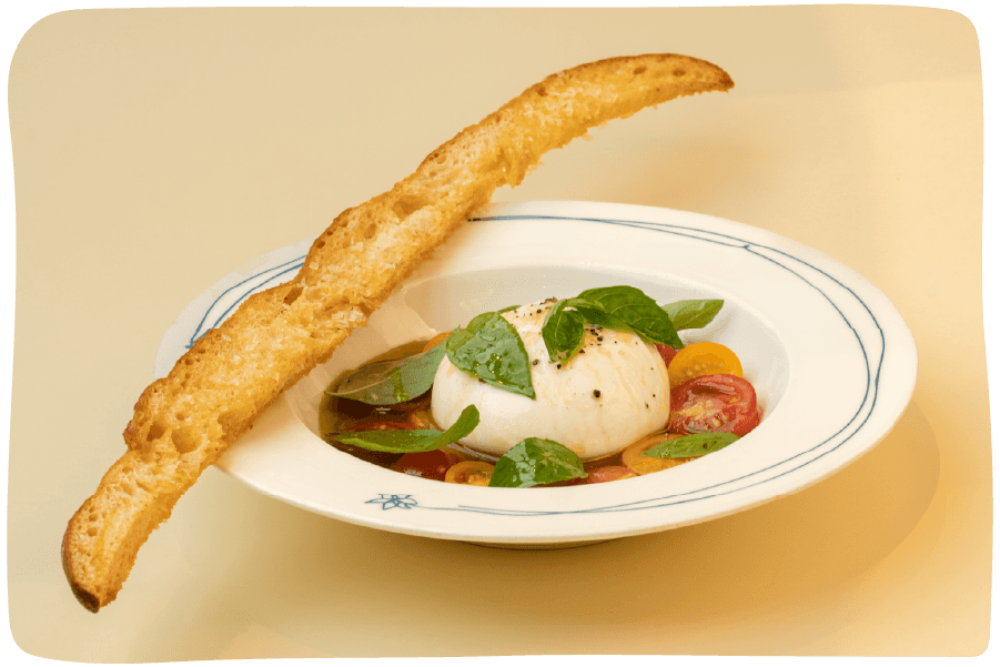 جبنة بوراتا الطازجة، طماطم كرزية، خل شيري، ريحان، توت أحمر، زيت زيتون بكر، زيت أخضر وخبز باغيت