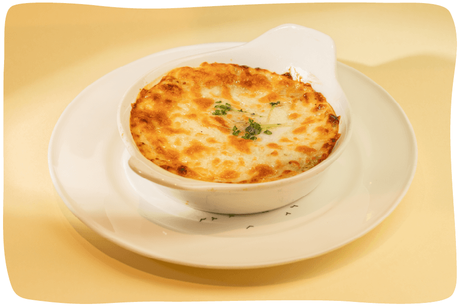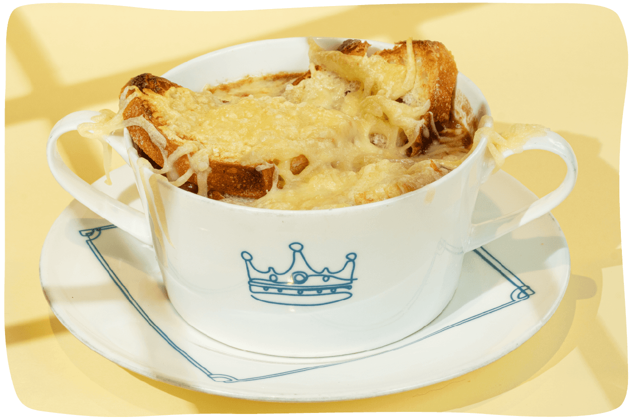 حساء فرنسي، جبنة إمنتال، قطع خبز محمصة (كروتونز)