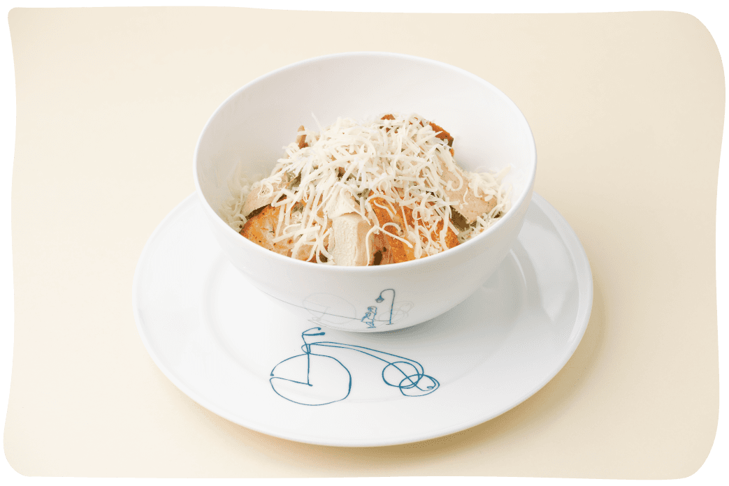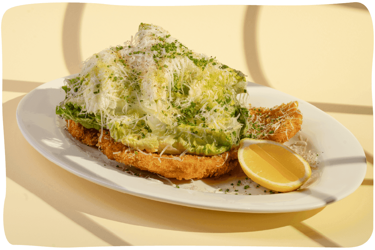 Crispy breaded chicken escalope toped with caesar salad and parmesan