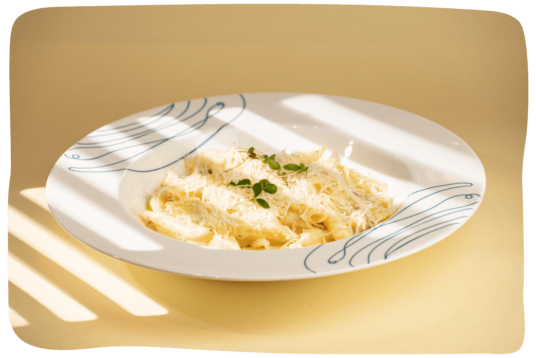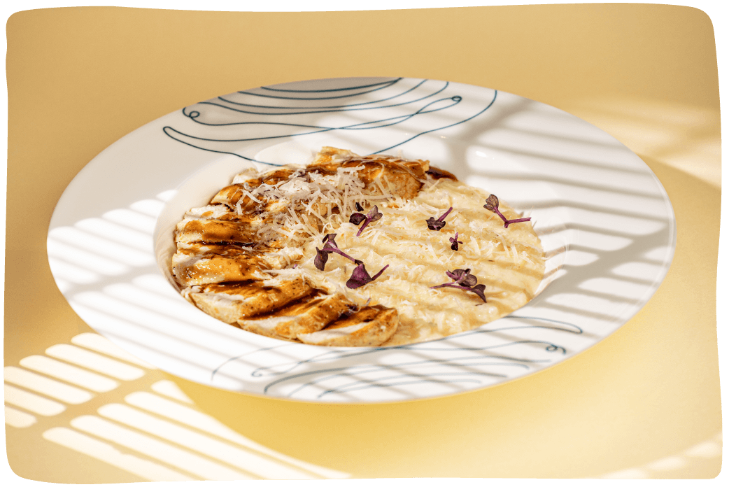 سمك سيباس محمّص بشكل مثالي يُقدَّم مع باستا الأورزو المتبلة، مزين بالأعشاب الطازجة ولمسة من الحمضيات