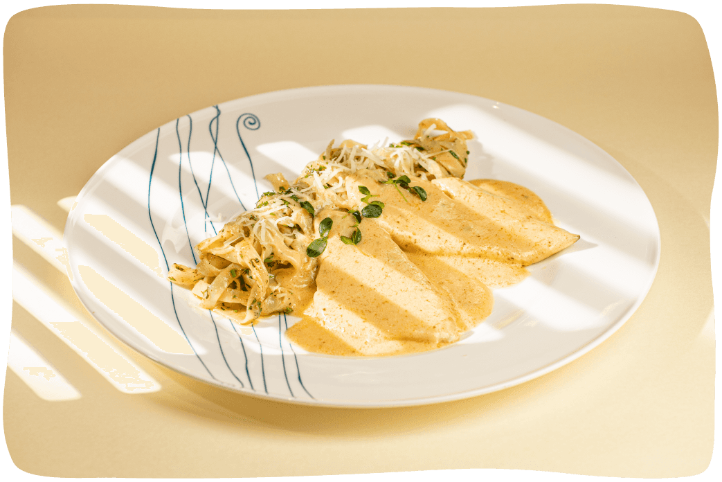 Organic chicken escalopes, lemon sauce, pesto sauce, tagliatelle pasta