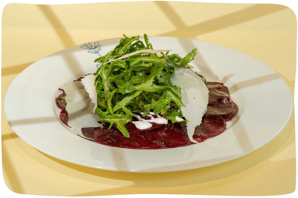 Roasted beets, goat cheese puree, guacamole, arugula and parmesan cheese