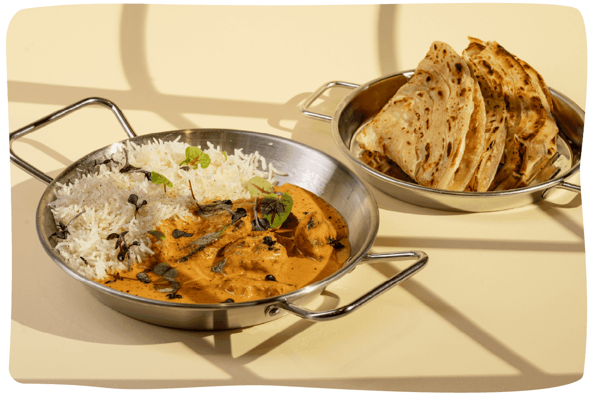 Butter chicken, creamy tomato sauce, white rice, paratha, coriander