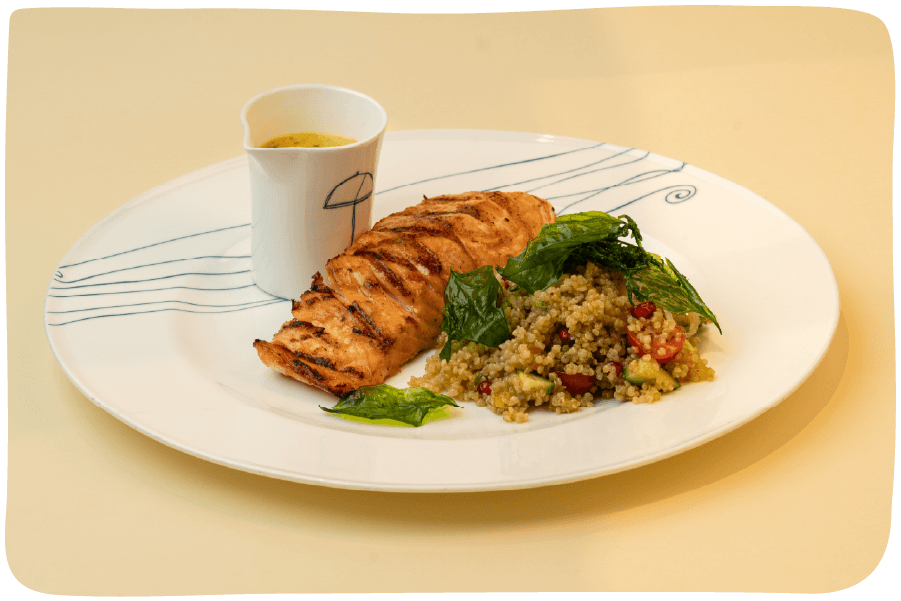 سلمون النرويجي مع صلصة الميزو، الكينوا مع صوص اكليل الجبل