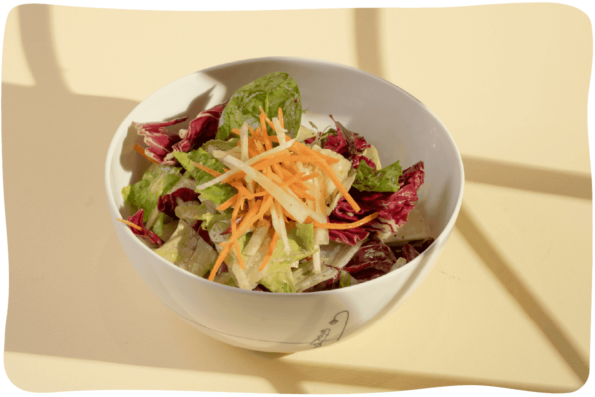 خليط من الأوراق الخضراء الطازجة، خيار، جزر، أناناس، وبصل أخضر، مع صلصة فينيجريت خفيفة