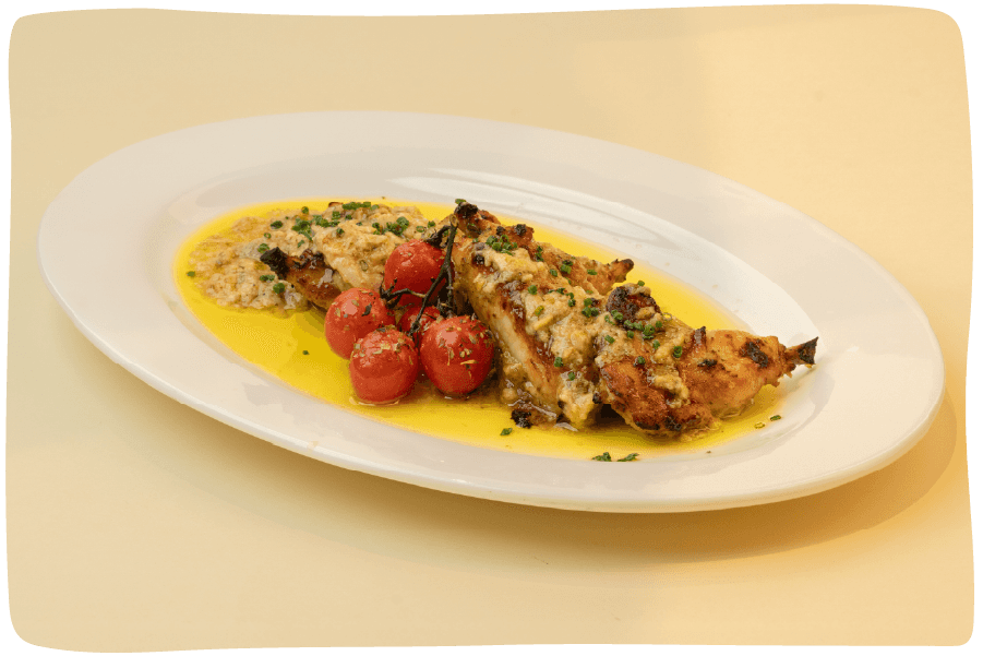 Roasted baby chicken marinated in lemon, thyme, garlic, lemon confit, de provence herbs and honey served with white rice