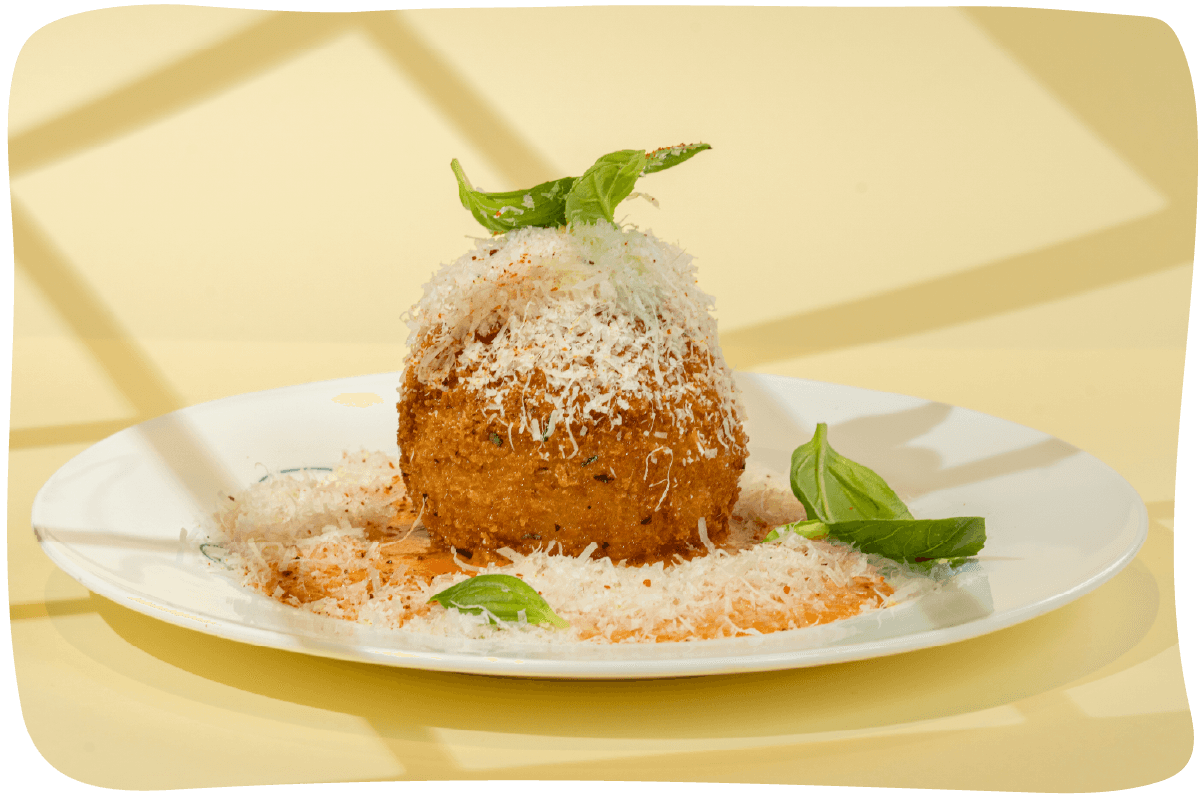كرات ريزوتو مقلية مقرمشة محشوة بالموزاريلا ولحم راجو، تُقدم مع صلصة الطماطم بالريحان