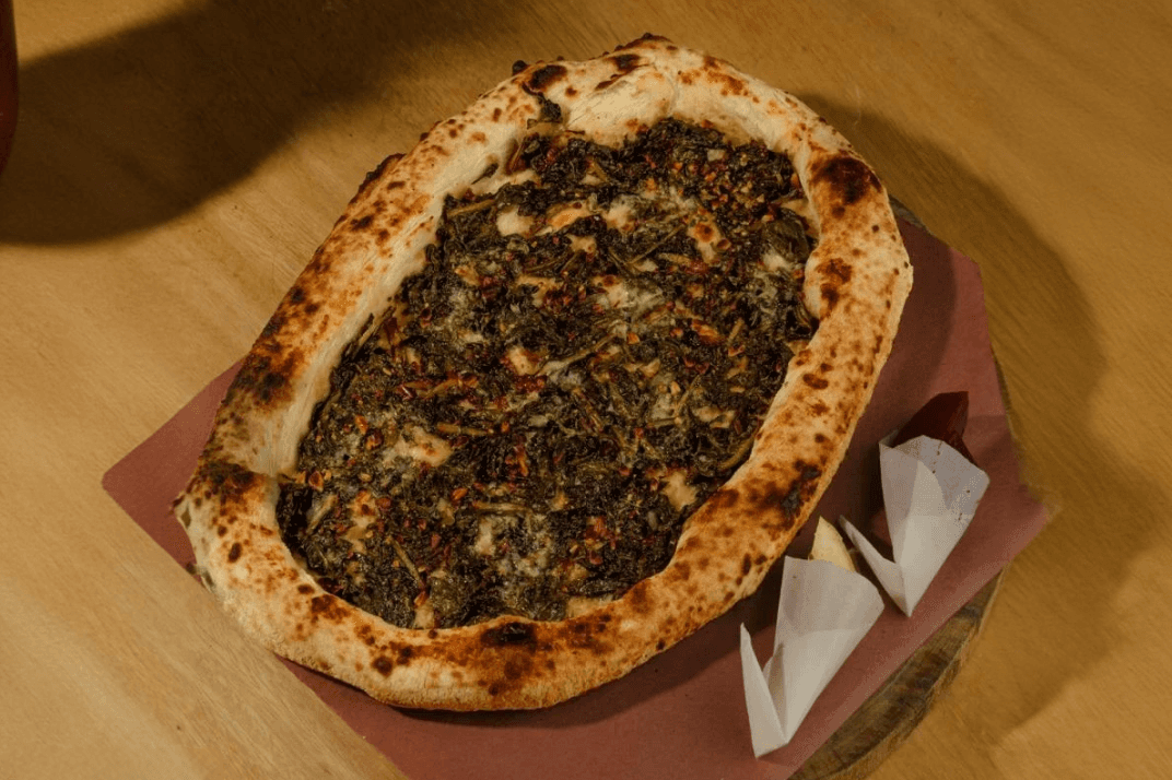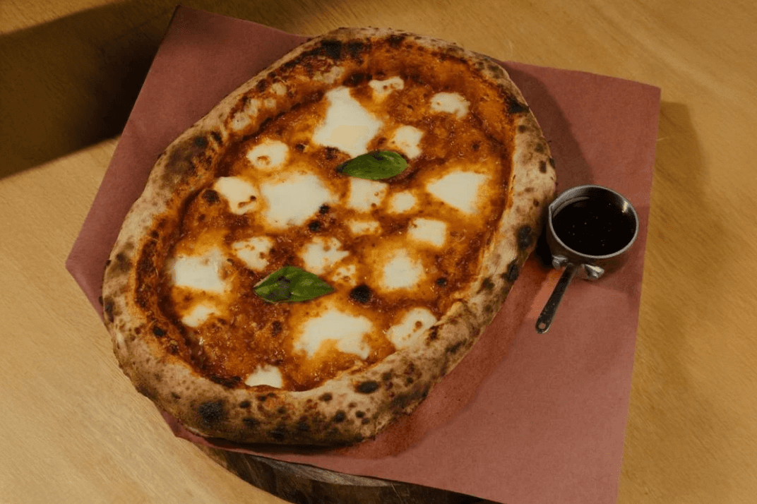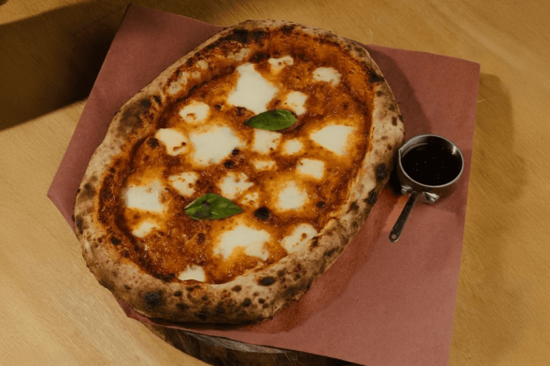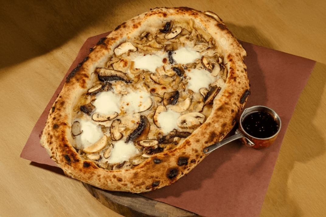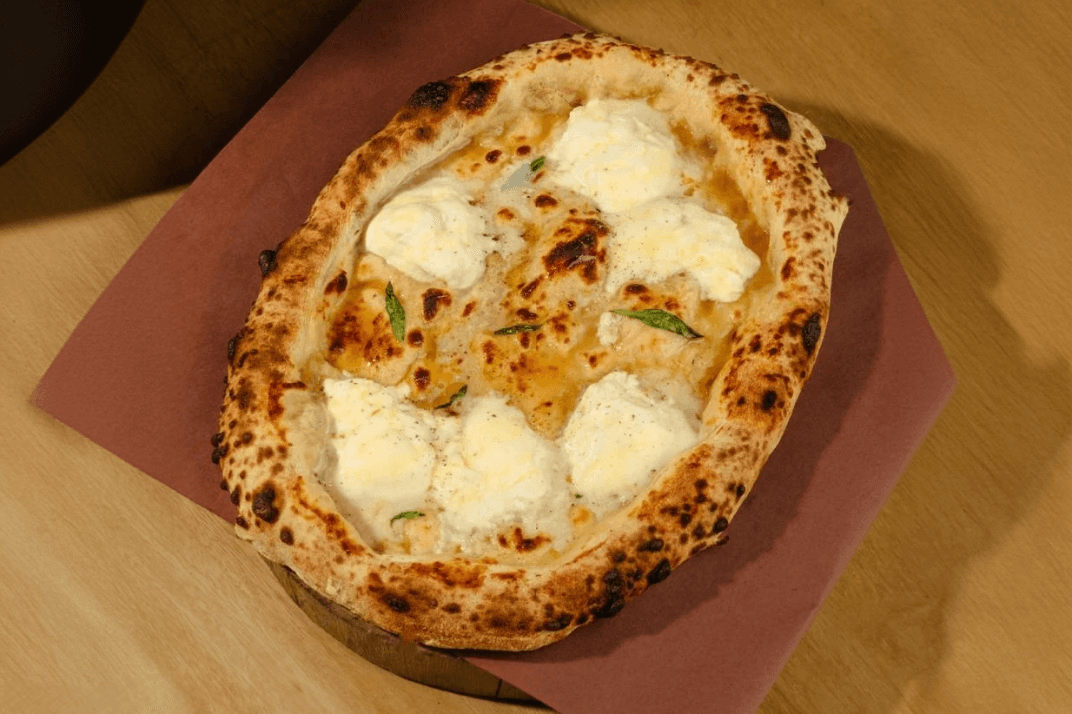 Pizza dough, Creamy white sauce, Burrata cheese, Crushed black pepper and Burnt honey.