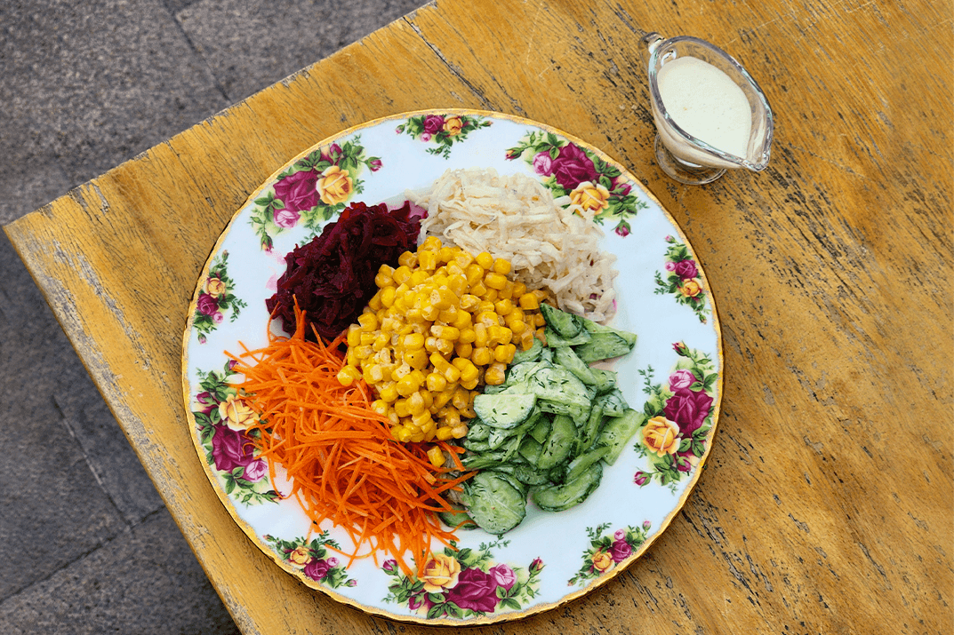 Carrots, Sweet corn, Cucumber, Beetroot, Celeriac, Yogurt dressing, Vinaigrette dressing, French dressing, Curry powder.