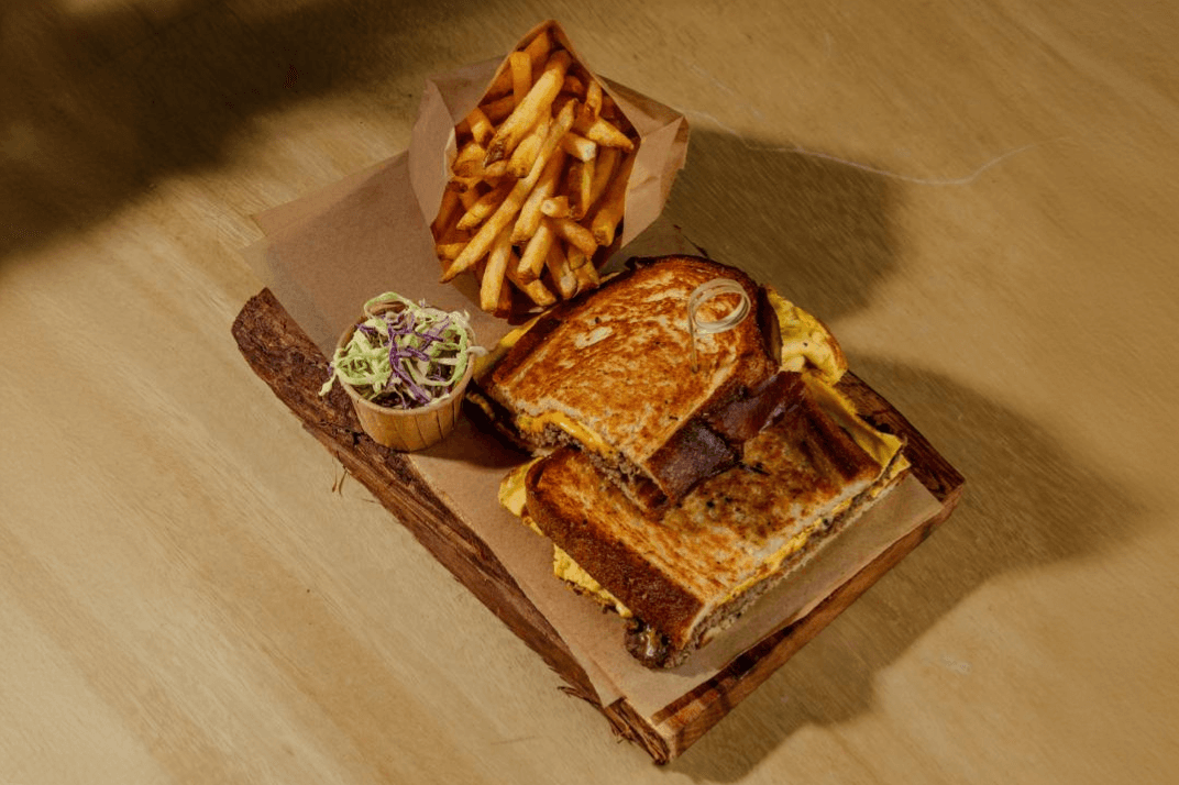 Brioche bread, Burger patty, Mild cheddar cheese, Egg mix, Thin fries.