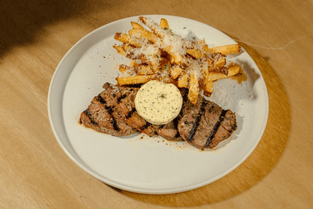 Sweet garlic marinated tenderloin, Herb garlic butter, Parmesan cheese, Chili rub, Hand cut fries.
