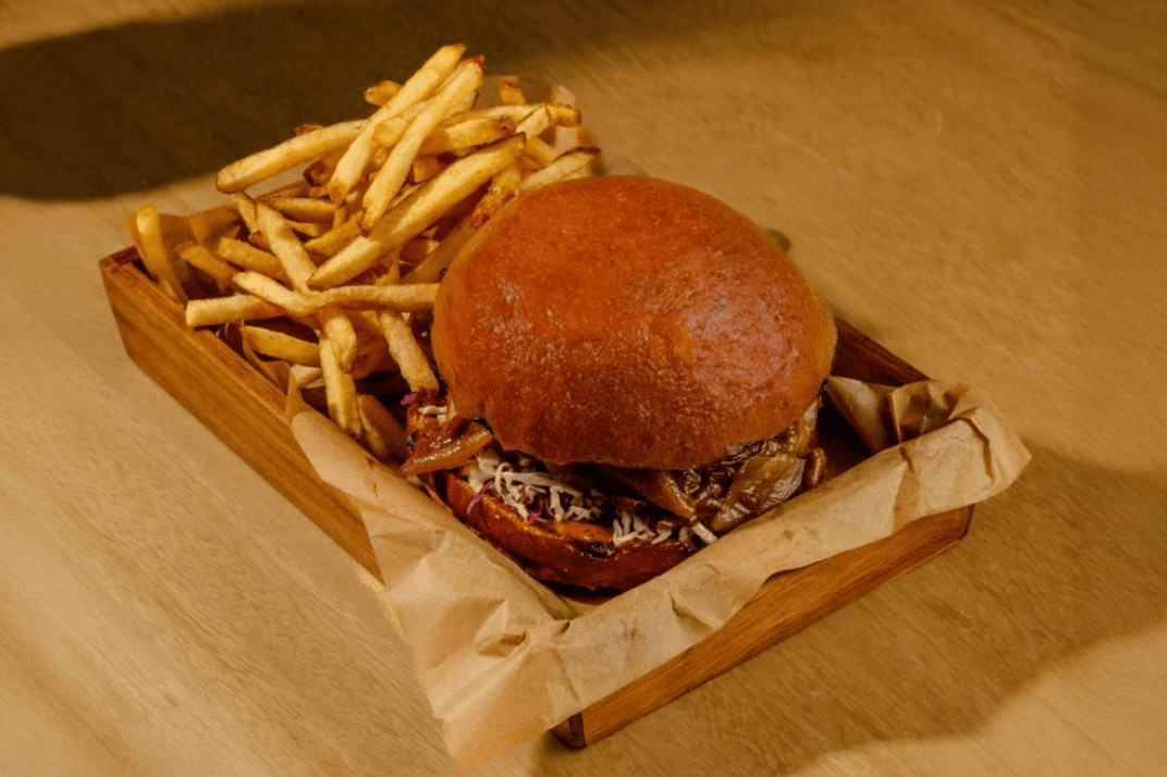 Sesame brioche bun, Burger patty, Fontina cheese, Mix cabbage, Dried cranberry, Ancho aioli, Demi glace cream, Onions, Sautéed mushroom, Hand cut fries.