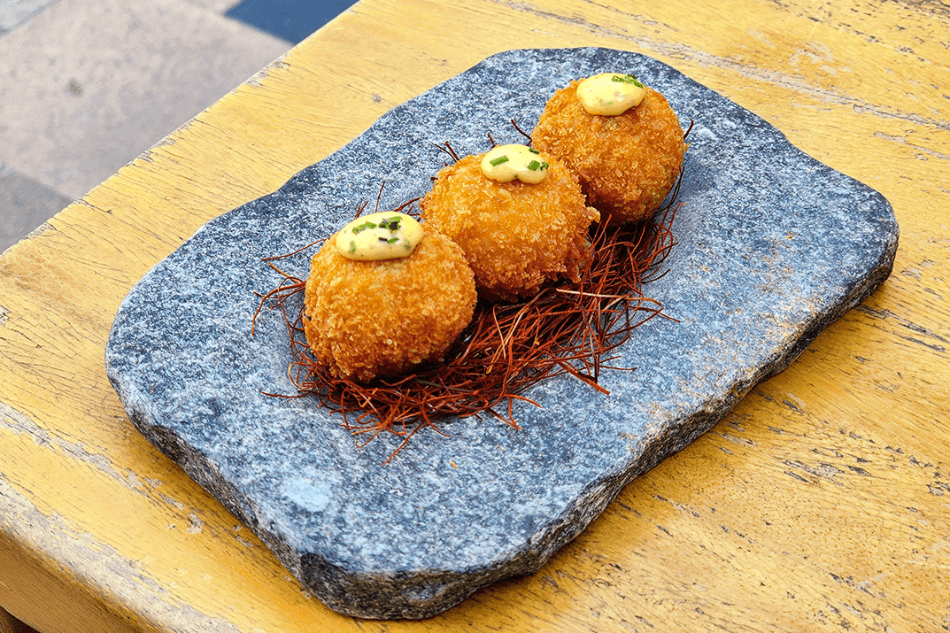 Croquettes stuffed with chicken Cheese Potato Serrano coriander aioli sauce Chili thread.