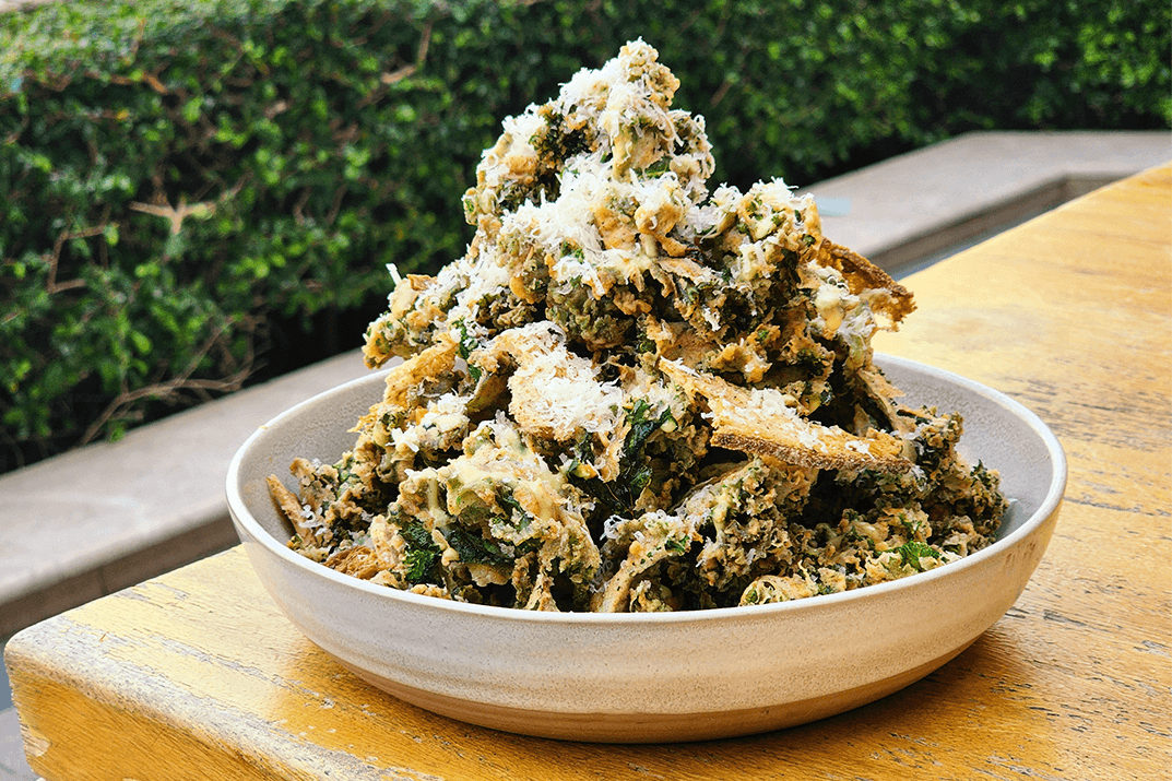 Fried kale leaves, Okra breading, Laban, Parmesan Cheese, Zaatar pine nuts feloncino, Pine nuts, Sweet chilli ponzu and Caesar dressing.