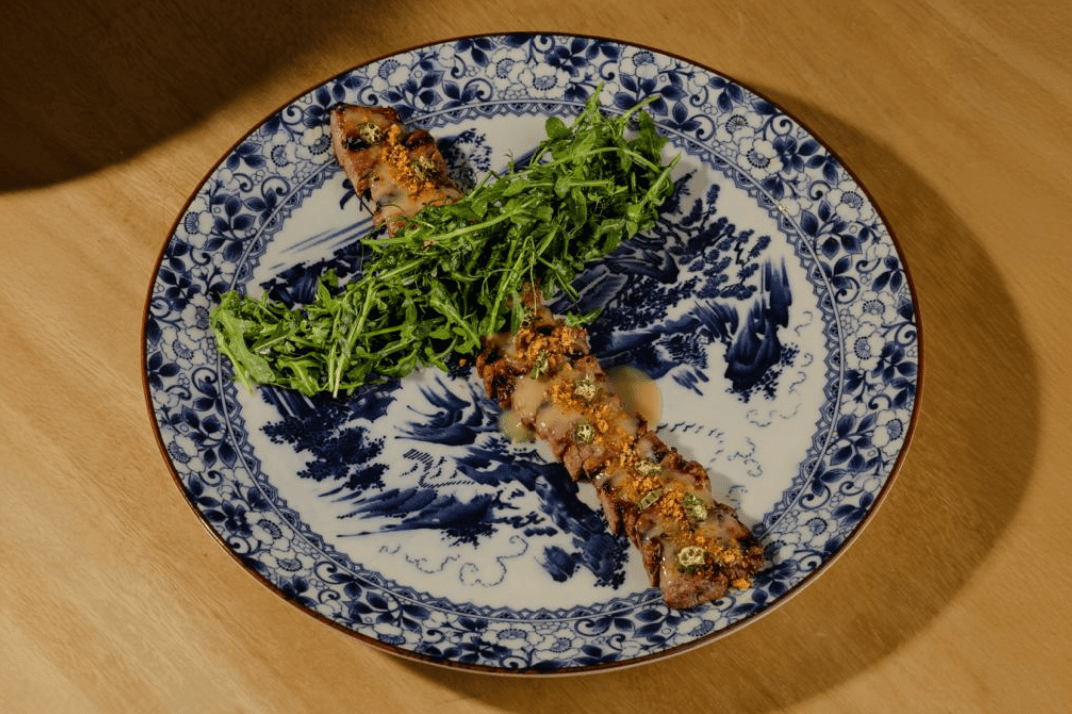 Miso marinated tenderloin, Dehydrated okra, Mix greens, Citrus dressing, Miso sauce.