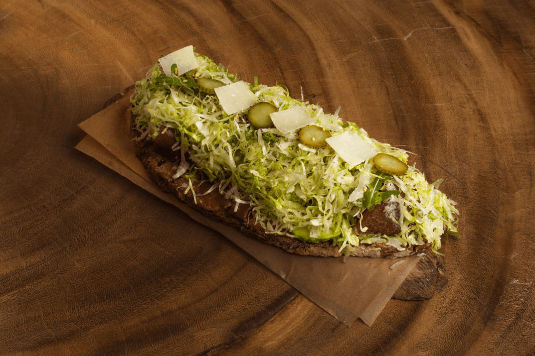 بريسولا مع أفوكادو وخضار ورقية على خبز ساوردو